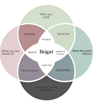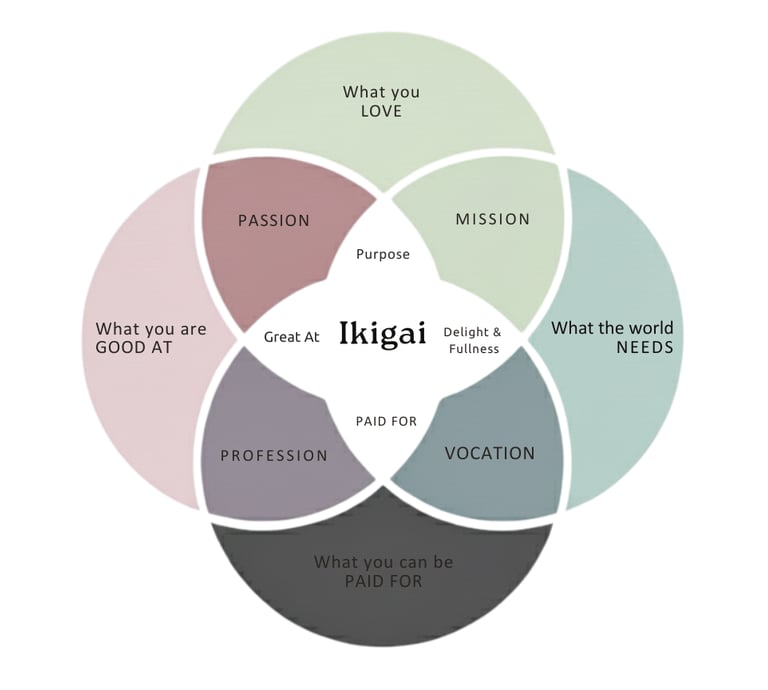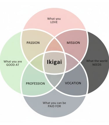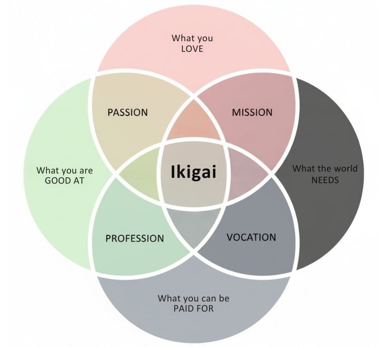 In Japanese, ikigai (生き甲斐) is your "reason for being." It's the intersection of what you love, what you are good at, what the world needs, and what you can be paid for.
